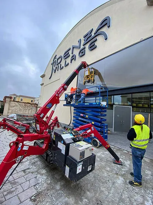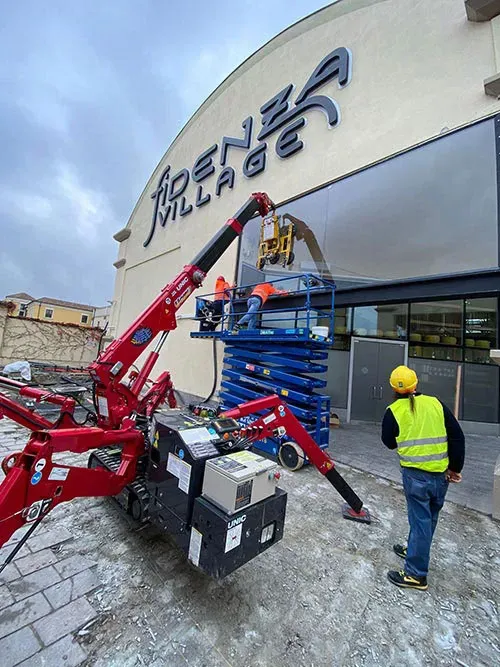 We used the MINIGRU 295 with the DSLMH2 MOTORIZED WINDSCREW for the safe installation of these windows at the Village Fidenza outlet.