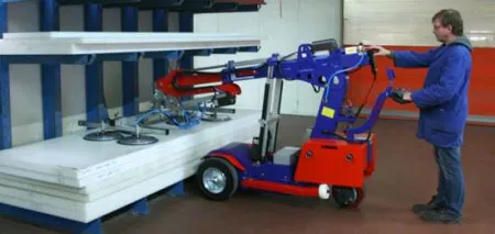 The KS Robot 600, an electrically driven vehicle, for lifting and mounting heavy glass, windows, doors, sheet metal, stone-, wood-, or PVC plates. The KS Robot 600 handles with ease, loads up to 600 kg.