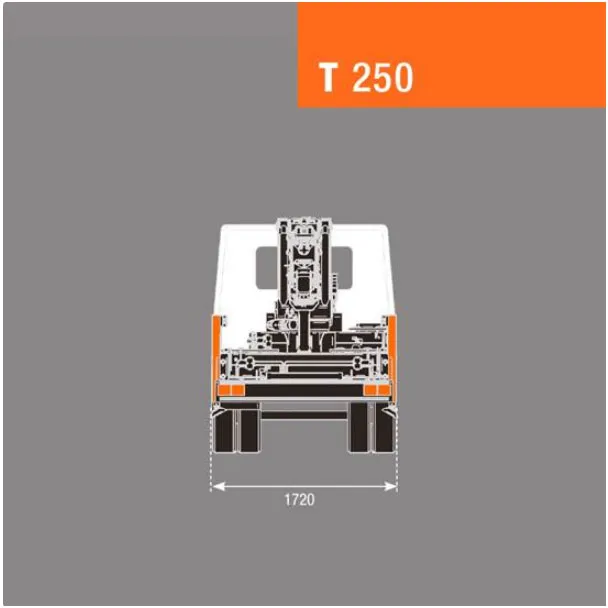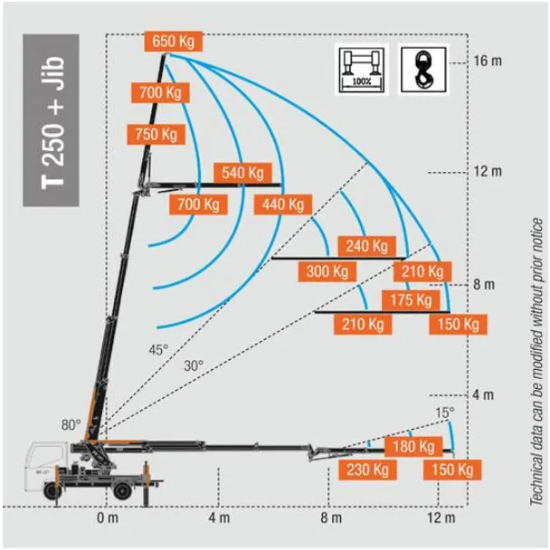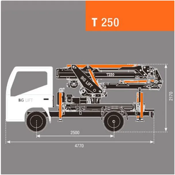 COMPATTA: La BG-T250 è alta solo 2170 mm, grazie alla bassa torretta ed al JIB che si ripiega sotto il braccio principale.