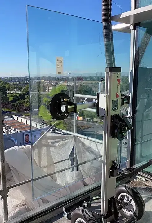 - Interasse variabile per adattarsi alla forma del vetro. Possibilità di trasporto laterale
