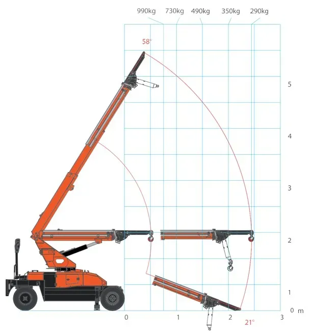 Grazie, poi alla possibilità di installare un falcone multi-posizione, oltre al gancio sul braccio principale, può operare anche in abbinamento a Ventose sospese, argani per il sollevamento, e tutta una serie di accessori sotto-gancio.