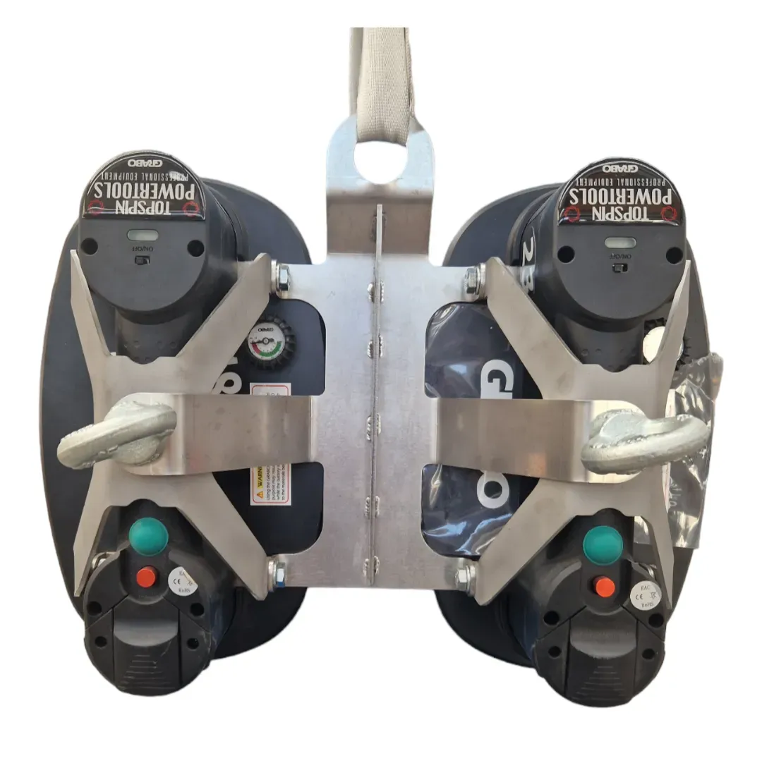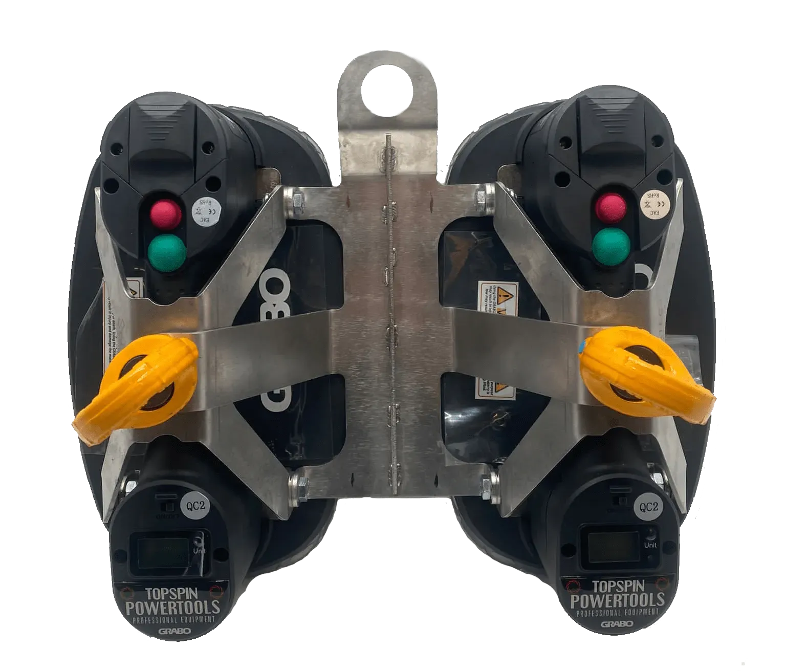 La nuova piastra di sollevamento doppia G-WING, permette di utilizzare le pratiche ventose manuali, anche con apparecchiature di sollevamento industriale, per esempi Carri Ponte, Bandiere o qualsiasi attrezzatura dotata di gancio.