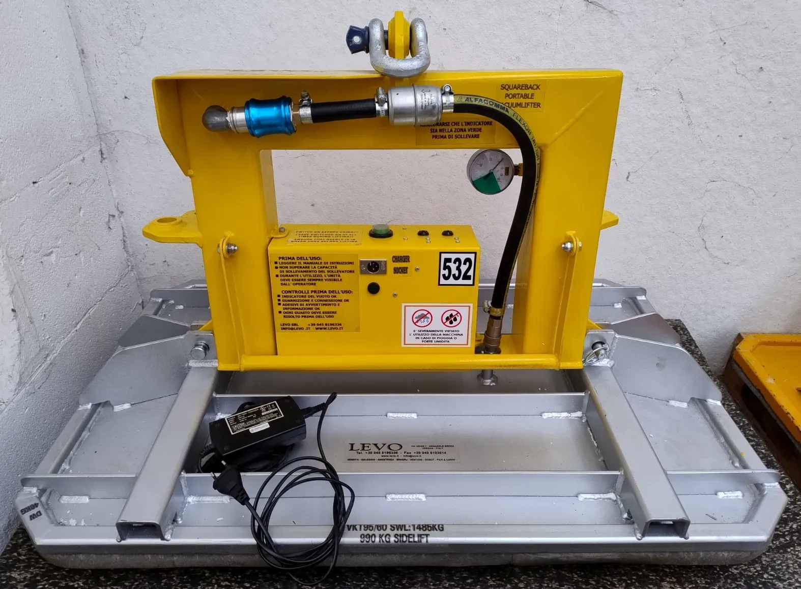 Di dimensioni contenute, ed un peso a vuoto di soli 22 kg (piastra esclusa), integra al suo interno una batteria ad alta capacità, che le permette di essere utilizzata senza l’intralcio del cavo di alimentazione e di un sistema di segnalazione ottico/acustico che controlla il livello del vuoto segnalando il livello troppo basso del vuoto all’interno della piastra aspirante.